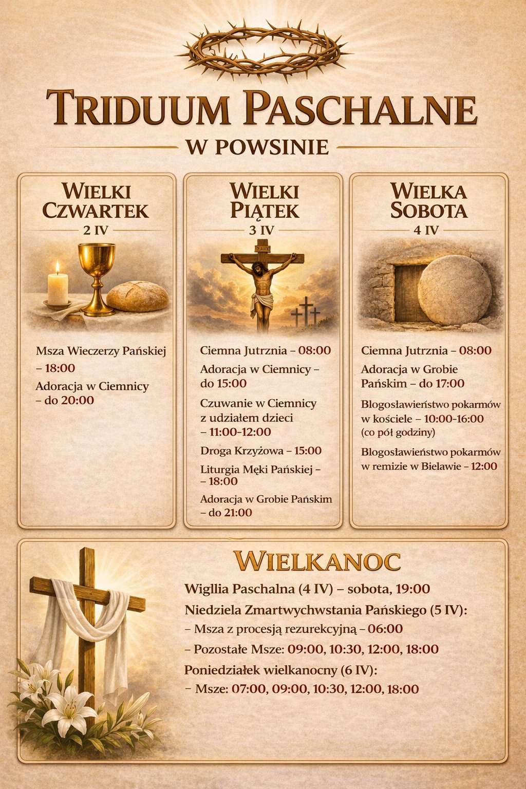 Pełen plan wydarzeń na dni świąteczne - od Wielkiego Czwartku do Poniedziałku w Oktawie Zmartwychwstania Pańskiego - kliknij, by zobaczyć plakat w większym rozmiarze.