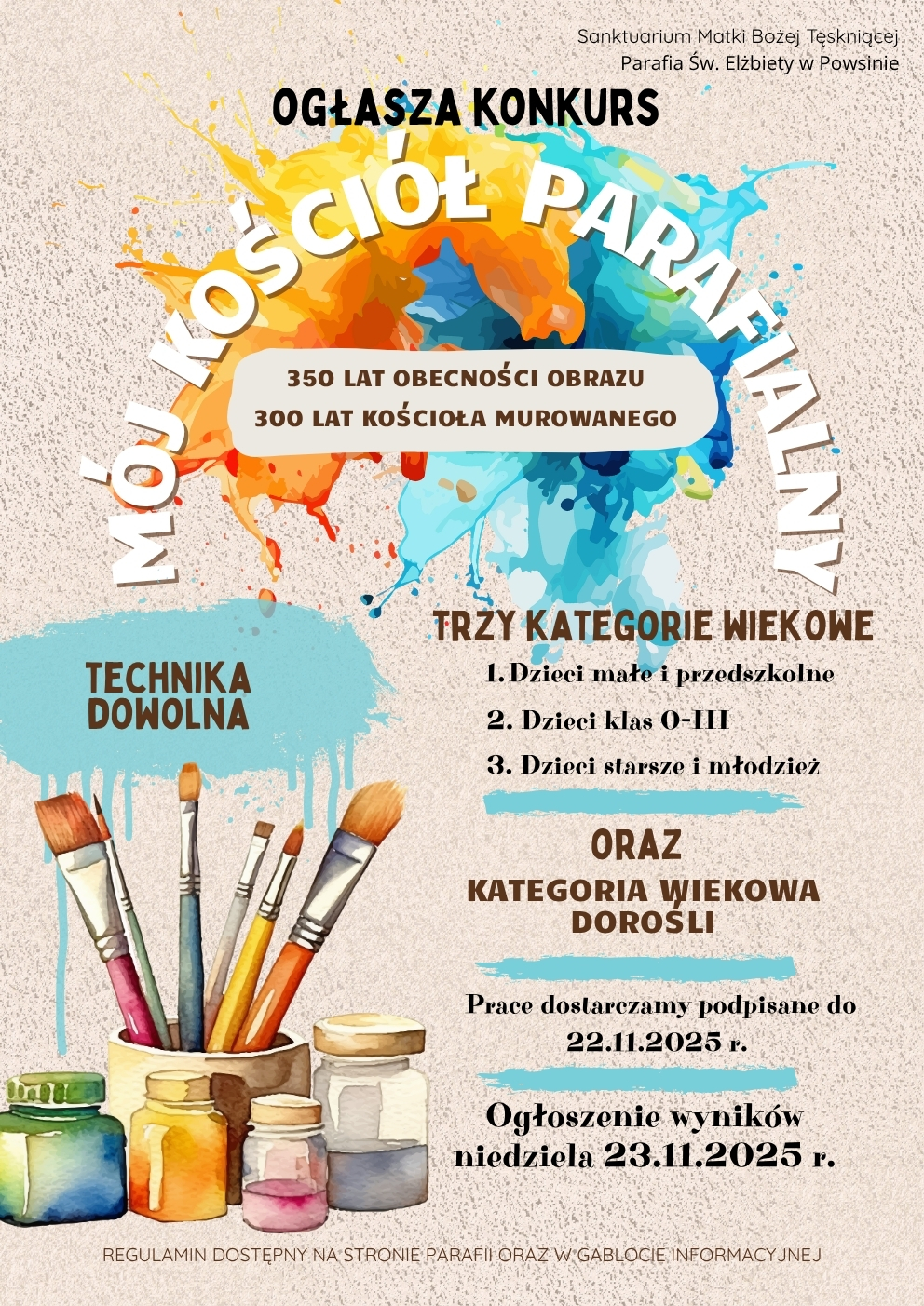 W Parafii Rzymskokatolickiej św. Elżbiety w Powsinie odbył się wyjątkowy konkurs plastyczny dla dzieci, młodzieży oraz dorosłych pod hasłem „Mój kościół parafialny”. Tematyka nawiązywała do szczególnie ważnego dla wspólnoty Roku Jubileuszowego, trwających obchodów Odpustu św. Elżbiety, a także dwóch wielkich rocznic: