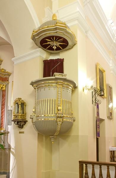 Wśród nich - oko przyciąga piękna, barokowa ambona - wykonana z drewna, zdobiona polichromią i dukatowym złotem. Przez wieki służyła i służy dalej do głoszenia Słowa Bożego i przypomina o kaznodziejach, którzy z niej przemawiali.