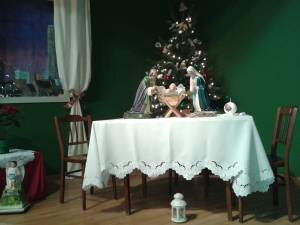 Muszę powiedzieć, że tegoroczna szopka bardzo mi się spodobała. Gdy ją po raz pierwszy zobaczyłam pomyślałam o rodzinie. Zwyczajny dom, raczej pokój, a w jego rogu świąteczna choinka. Na środku stół nakryty białym obrusem a na nim mały żłóbek z Dzieciątkiem Jezus, obok figury Maryi i św. Józefa. Przy stole stoją trzy krzesła, jak gdyby domownicy przed chwilą wyszli z pokoju. Może w kuchni kończą przygotowania do wieczerzy wigilijnej. Niemal czuć zapach pieczonego makowca i gdyby wsłuchać się uważniej, doszłyby do naszych uszu dźwięki kolędy „Cicha noc”, które nuci mama krzątając się przy kuchni. Za oknem ozdobionym jasnymi zasłonami widać panoramę Warszawy (widok znany nam z dekoracji szopki w 2012 r.). Spokojny rodzinny dom, w którym na pierwszym miejscu znajduje się Jezus – tak powinno być, ale czy tak jest w naszych rodzinach? Serdeczne podziękowania dla pomysłodawców i wykonawców powsińskiej szopki.