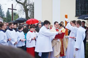 Przed rezurekcją, mimo chłodu, wyszła procesja wielkanocna. Ze względu na pogodę nie wszyscy zdecydowali się wziąć w niej udział. Tradycyjnie strzelano petardami. W procesji brali udział młodzi strażacy ubrani w odświętne, galowe mundury. W trakcie Mszy św. rezurekcyjnej byłem mile zaskoczony faktem, że wśród wiernych przyjmujących Pana Jezusa byli strażacy z Bielawy. Zwyczajem poprzednich lat procesję i Mszę św. uświetniła swoją profesjonalną grą orkiestra dęta z Warszawy. Na zakończenie rezurekcji ks. proboszcz Lech Sitek podziękował zespołom parafialnym, tj. ministrantom, Bractwu Trójcy Przenajświętszej, chórowi parafialnemu oraz lektorom, którzy dobrze się przygotowali do czytania Pisma Świętego podczas nabożeństw i Mszy św.
